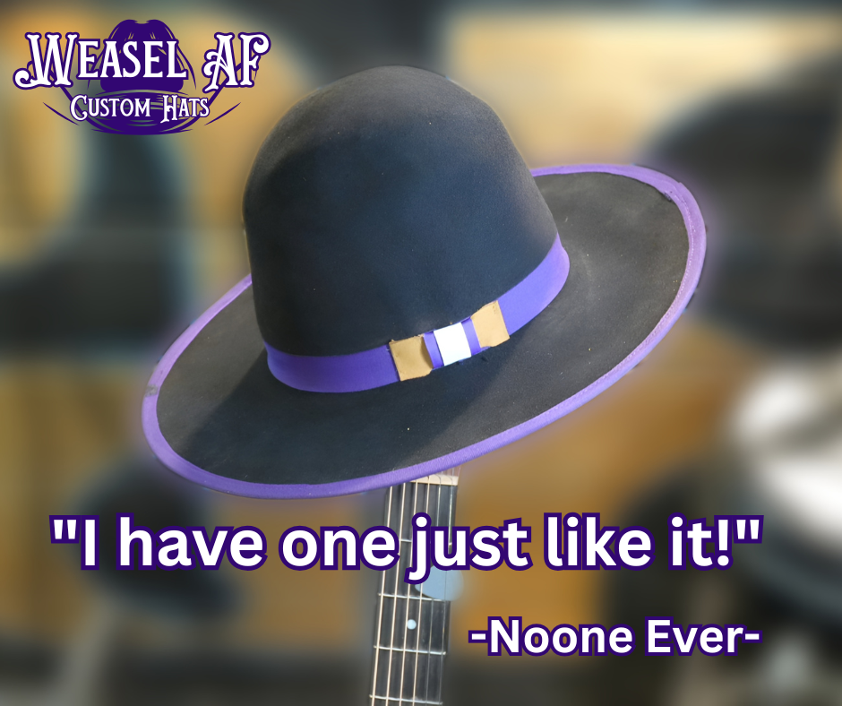 Owners Bo “Weasel” Barnes and Misty Folger live in Merkel, TX. Bo has been playing live music and entertaining crowds for over 25 years. He has been fixing hats and making customs for the last 5. Misty is the behind-the-scenes creative mastermind in most of what we do in the hat world.